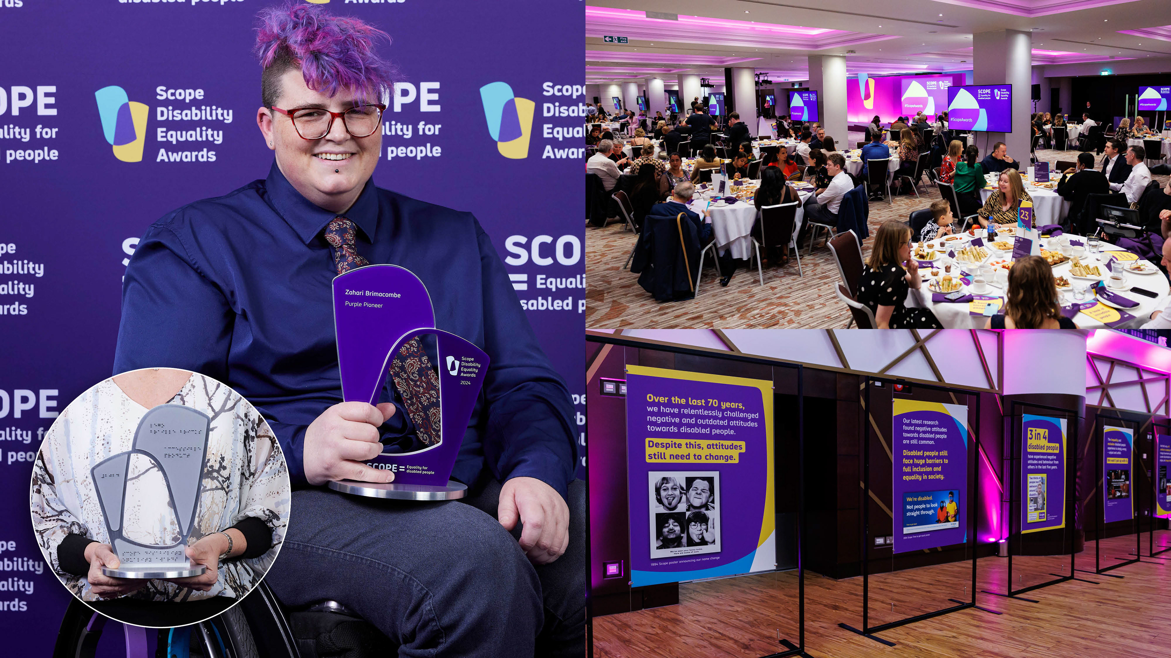 Co-produced and accessible 2024 Scope Awards trophy, Braille side (L), ceremony and attitudes exhibition 2022 Scope Awards (R)