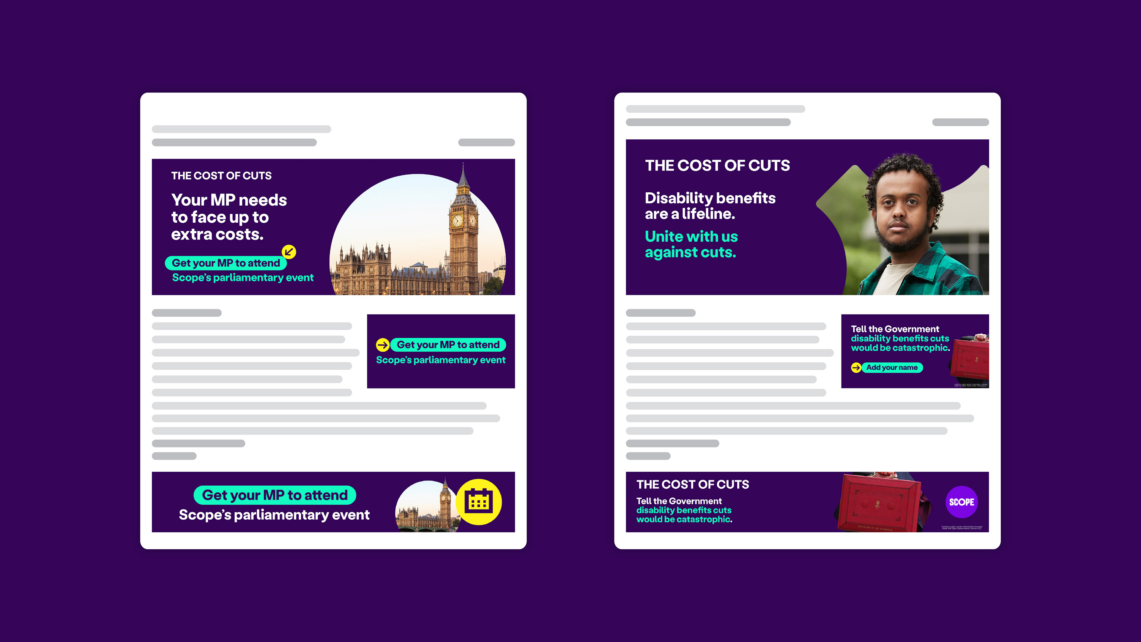 As lead designer on a digital first campaign urging the government not to bring in catastrophic cuts to disability benefits, I developed a creative direction that ensures disabled people’s concerns are being heard. The campaign addresses the negative media rhetoric and online misinformation around disabled people and benefits.